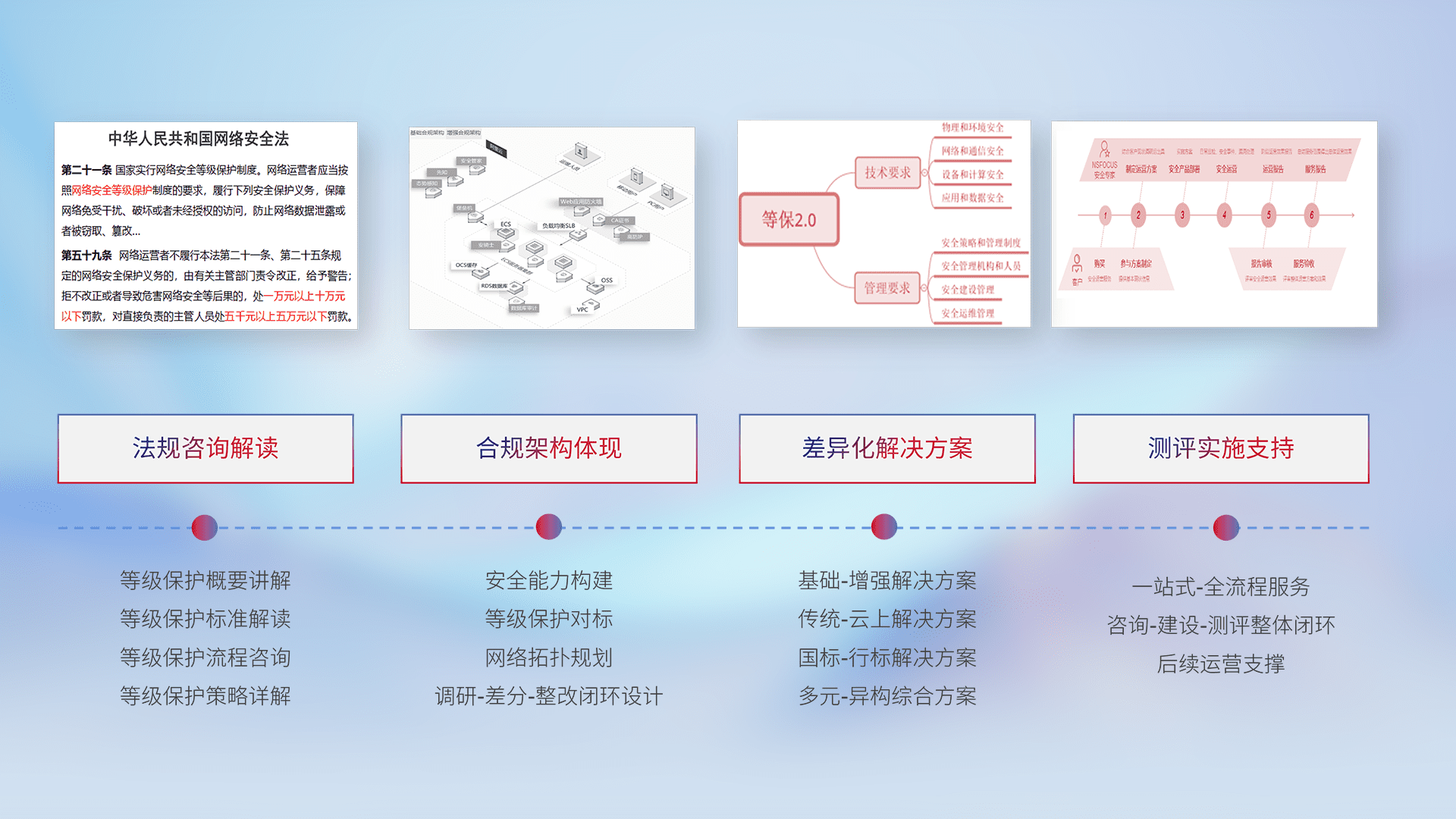 通过专业的法律咨询解读、、、、合规架构体现、、、差异化解决方案、、、测试实施支持等服务,,,,为客户量身打造等保合规体系。。。